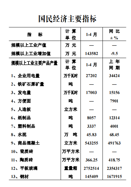 4月末,全縣在庫規模以上工業企業119家。1-4月全縣實現規模以上工業增加值143582萬元,同比下降9.5%,環比一季度回落12.8個百分點。
