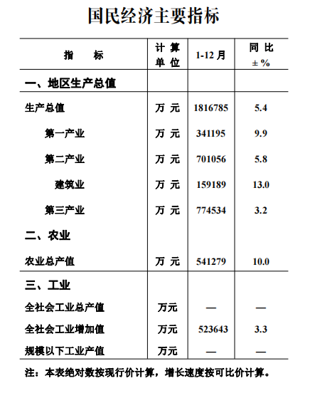 根據河源市地區生產總值統一核算結果,2023年我縣地區生產總值為1816785萬元,同比增長5.4%。其中,第一產業增加值為341195萬元,同比增長9.9%;第二產業增加值為701056萬元,同比增長5.8%;第三產業增加值為774534萬元,同比增長3.2%。
