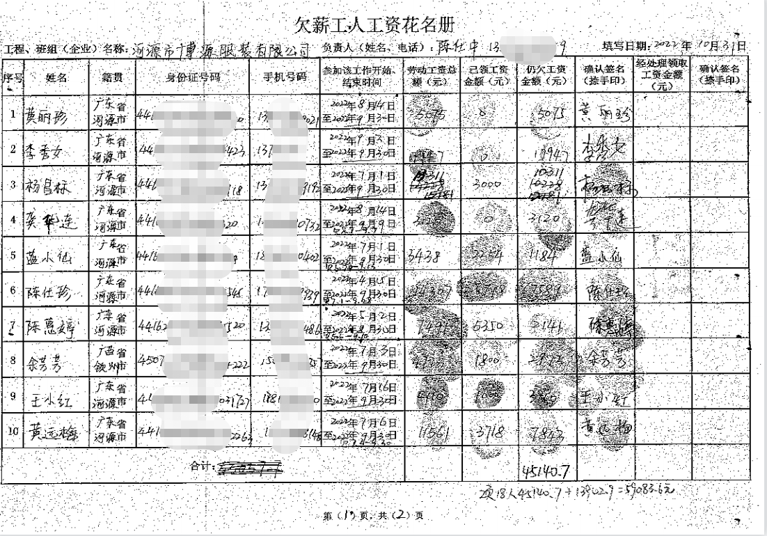 經調查:被處理單位在東源縣經營期間,存在拖欠黃麗珍、李秀女等18名勞動者自2022年5月6日至9月30日期間勞動報酬共計59083.6元的問題(詳見附件)。我局依法對被處理單位作出《勞動保障監察限期改正指令書》(東人社監字〔2022〕第247-6號)責令改正,被處理單位逾期拒不改正。鑒于被處理單位對存在的違法行為經我局責令整改逾期拒不改正,我局于2023年2月13日向被處理單位發出《勞動保障監察行政處理告知書》(東人社監字〔2022〕第247-7號),并告知在收到《勞動保障監察行政處理告知書》之日起三日內,攜帶有關證據材料向我局提出陳述和申辯。因被處理單位關閉單位經營辦公場所,相關負責人無法聯系,我局依照規定向被處理單位公告送達了法律文書,被處理單位逾期未提出陳述或者申辯。