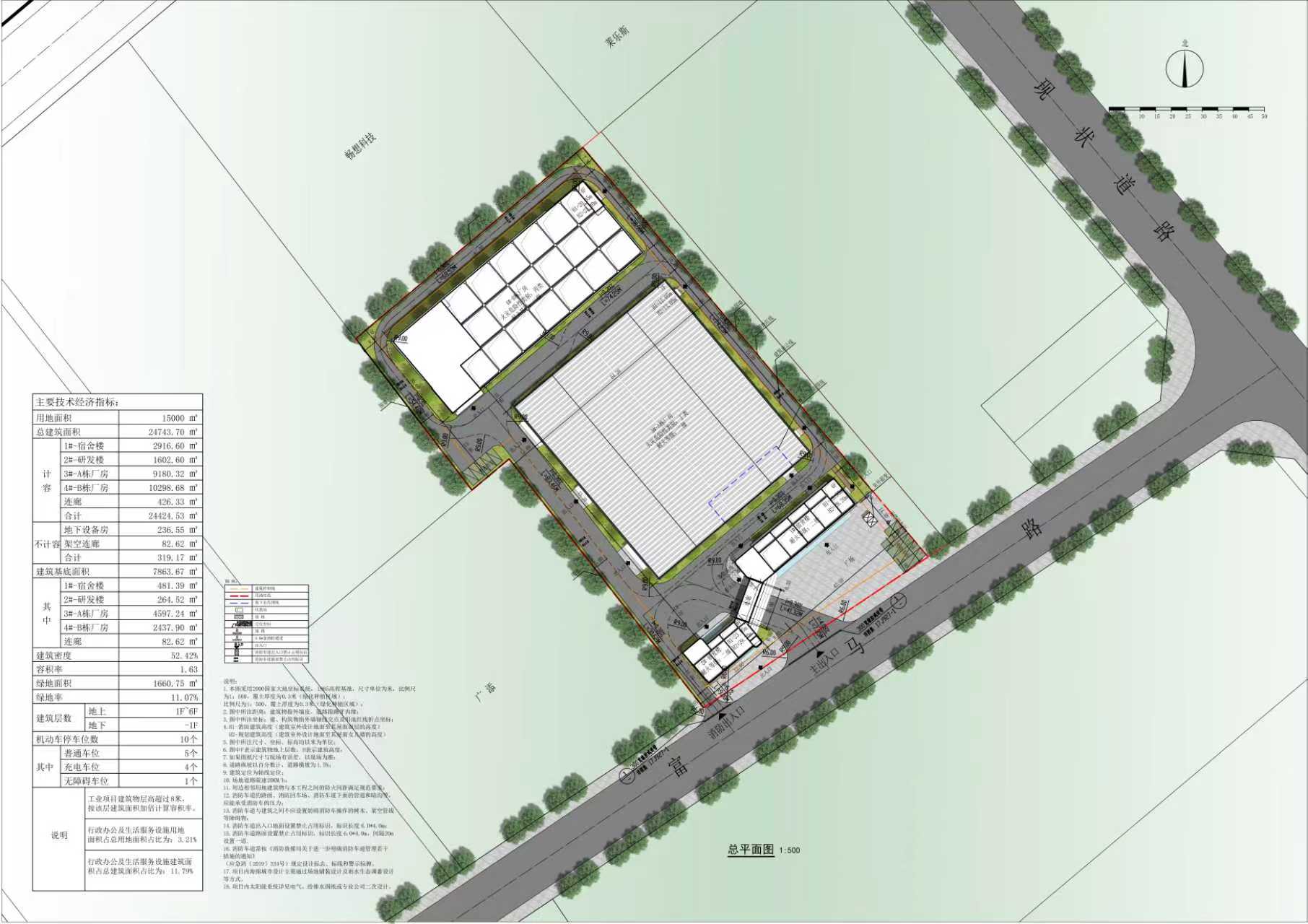 項目擬建設一棟六層宿舍樓,一棟六層研發樓,一棟單層丙類廠房及一棟四層丙類廠房,沿南門富馬路設主要出入口。方案主要經濟技術指標為:總建筑面積共24736.2平方米(其中計容建筑面積為24417.03平方米、不計容建筑面積為319.17平方米),容積率為1.63,建筑密度為52.37%,綠地率為11.88%。根據相關規定,我局將對該設計方案(具體方案詳見附圖)進行批前公示。