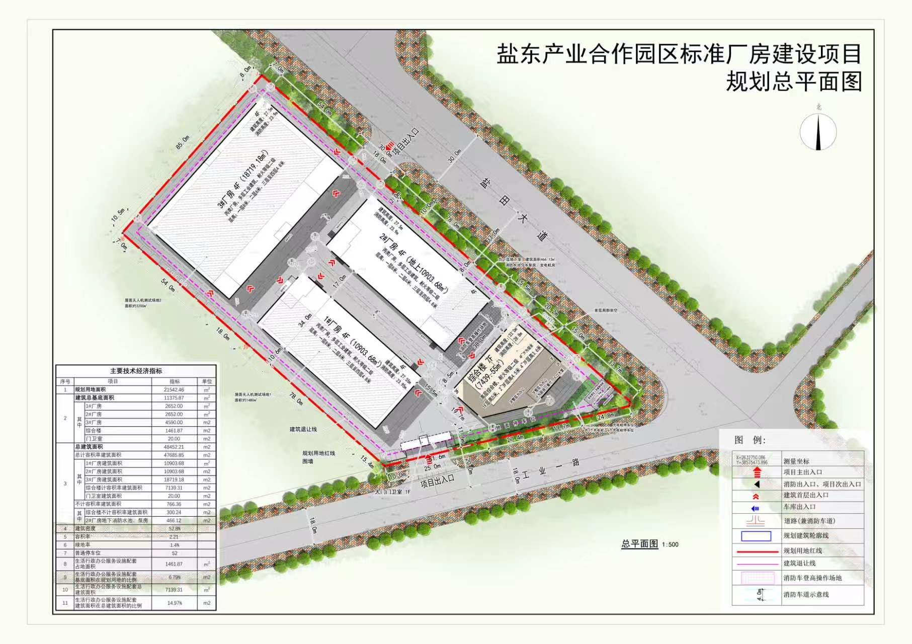 項目位于東源縣鹽(田)東(源)共建現(xiàn)代物流園工業(yè)大道以東、工業(yè)一路以北XT-02-13地塊,用地面積共21543.46平方米,用地性質(zhì)為工業(yè)用地,建設(shè)單位為東源縣鹽東產(chǎn)業(yè)投資發(fā)展有限公司。項目擬建設(shè)三棟四層丙類廠房,一棟七層綜合樓(一層為廚房、飯?zhí)谩⒓芸諏樱⑷龑訛檗k公區(qū),四至七層為宿舍),沿工業(yè)一路及鹽田大道設(shè)置主要出入口。方案主要經(jīng)濟技術(shù)指標(biāo)為:總建筑面積共48452.21平方米(其中計容建筑面積為47986.09平方米、不計容建筑面積為466.12平方米),容積率為2.23,建筑密度為52.8%,綠地率為1.4%。
